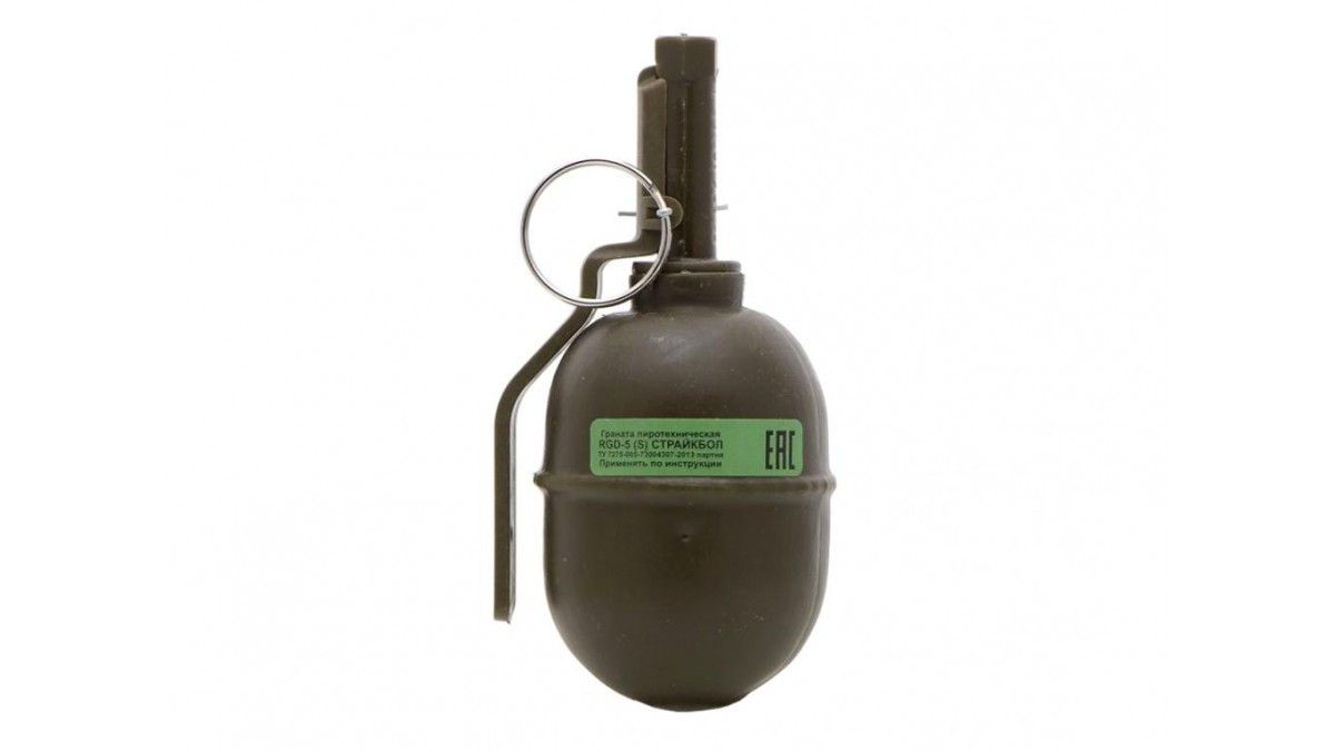 Учебно-имитационное изделие PFX RGD-5 (S) - оборонительно-наступательная граната для ведения ближнего боя (его имитации) в спортивных играх, кинопроизводстве, реконструкциях военных событий и военной подготовке. Артикул S означает - Страйкбольное. Учебно-имитационное изделие RGD-5 представляет собой копию гранаты РГД-5, которая имеет мягкий пластиковый корпус, запал PYRQFX - УЗРГМ со стальной чекой. Высота гранаты 125 мм, диаметр 56 мм. Весит граната 200 гр. Заряд гранаты весит 1,5 гр и дальность его разлета составляет до 20 м. Граната заполнена пылевым пигментом и инертным металлическим порошком. Время задержки 2,2-4,2 сек.