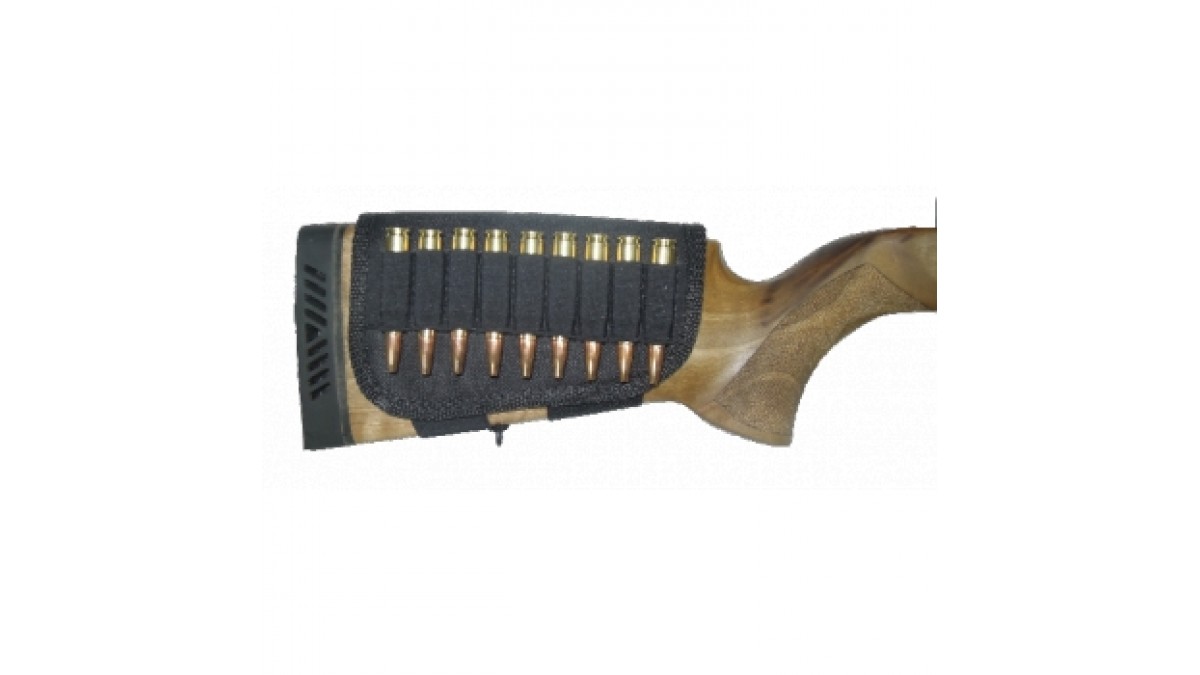 Патронташ на приклад 7.62 (ткань синтетическая) - открытый патронташ на 9 патронов к нарезному оружию калибра 7,62 мм. Изготовлен из прочного синтетического материала, долговечного в эксплуатации и легкого в уходе. Патроны в комплект не входят.