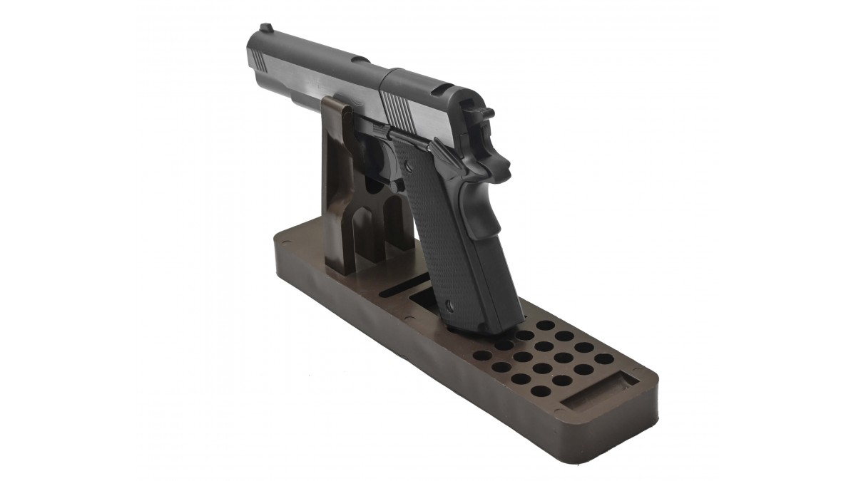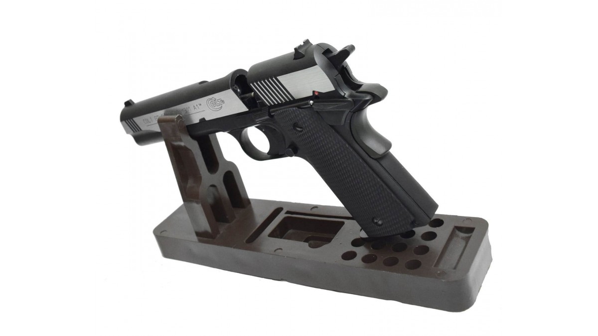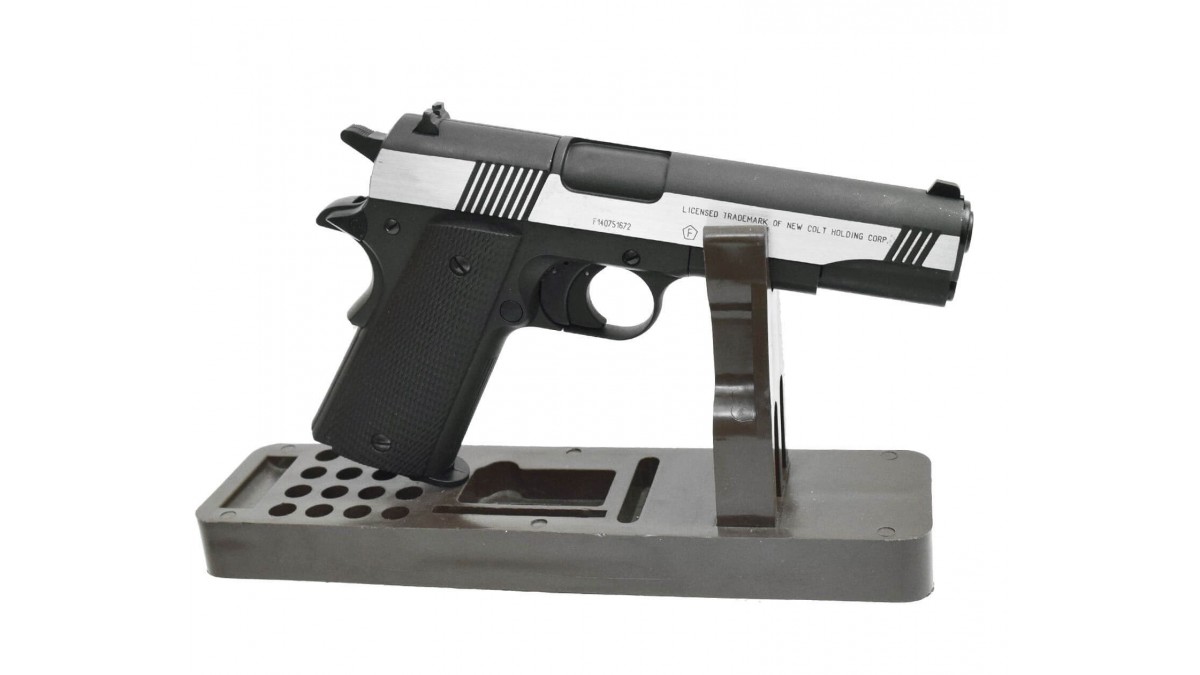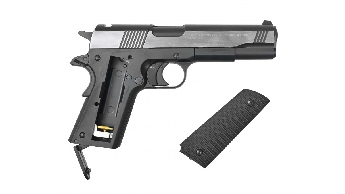 В отличие от остальных CO2 пистолетов Umarex 1911 питается из барабанного магазина емкостью 8 мест. Клип устанавливается под кожух затвора. Для установки элемента потребуется нажать на клавишу затворной задержки — затвор откатится вперед, освободив гнездо для установки.