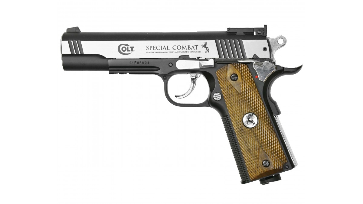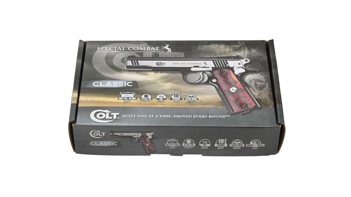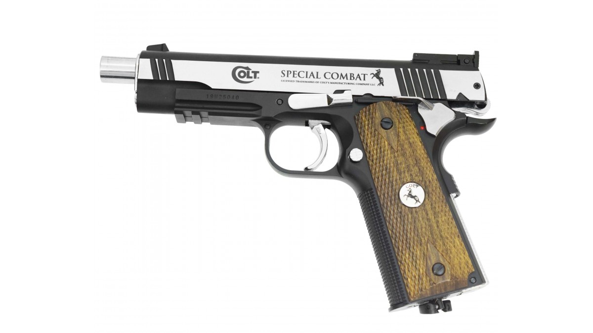 Кольт Спешл Комбат метает 4.5 миллиметровые шарики BB со скоростью до 120-125 метров в секунду. При этом, оружие способно произвести 70 выстрелов с одной заправки.