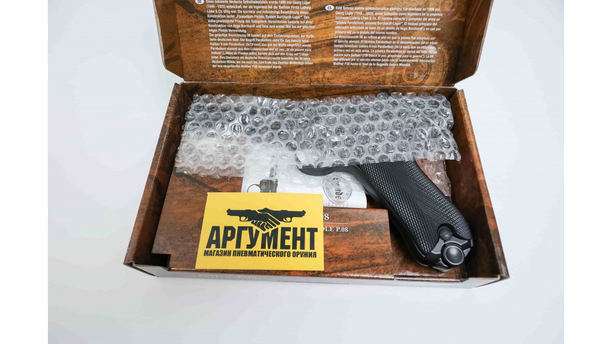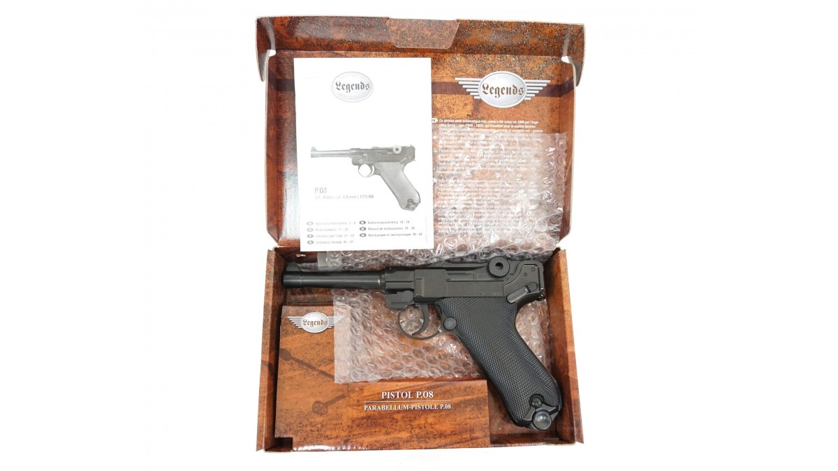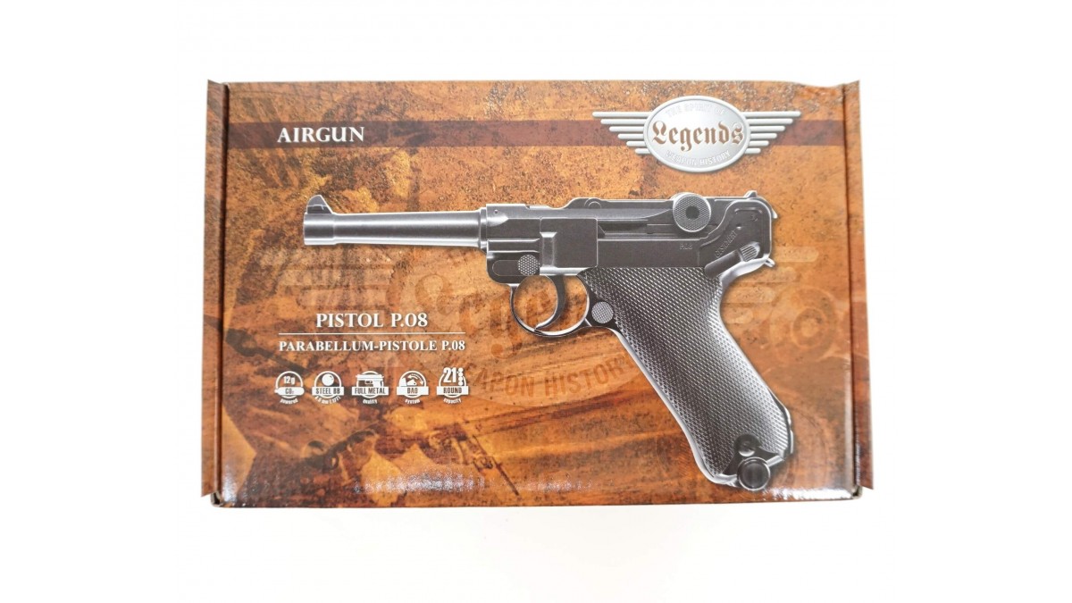 На смену ему в начале 2-й мировой пришёл более надёжный пистолет P38, однако "Люгер" оставался главным оружием офицеров Вермахта. Означенная пневматическая модель P.08 производителя Umarex является максимально точной копией огнестрельного прототипа, в том числе по массе. У модели есть подвижные части и "блоубэк". Сделана она полностью из металлического сплава, кроме накладок рукояти. На корпусе чёрное матовое покрытие, накладки на рукоятке тоже из чёрного пластика.