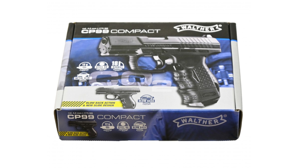 Имитация работы затвора пистолета автоматического типа в модели Walther CP99 Compact реализуется в качестве функции BlowBack и заключается в движении затворной рамы в момент выстрела, это увеличивает визуальную схожесть с оригиналом. Корпус пневматической модели пистолета сделан из ударостойких полимеров, что уменьшает массу конструкции - она составляет 755 г. Благодаря наличию специальных выемок для пальцев на рукоятке пистолет удобен в руке. В комплекте имеются сменные затыльники, предназначенные для подгонки под конкретную руку стрелка.