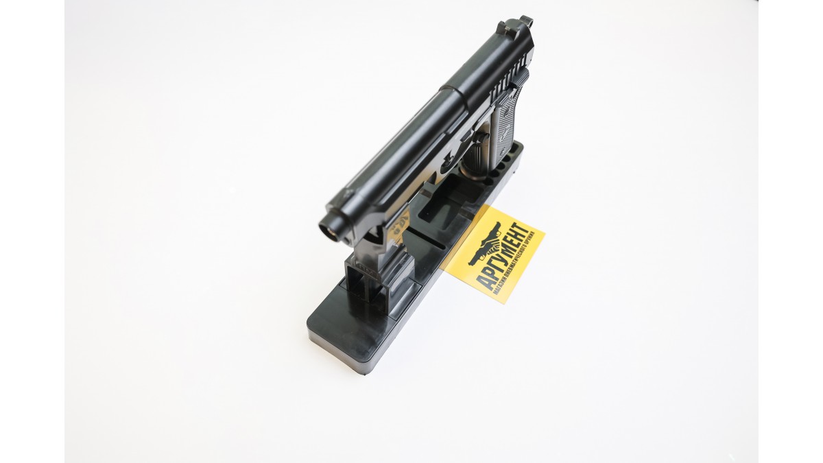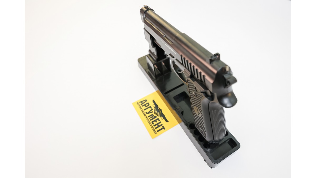 Модель в точности повторяет массу и габариты боевого прототипа, ее длина составляет 213 мм при весе почти в 1 килограмм, поэтому Borner Beretta 92 4.5 мм достоверно ощущается в руках. Вороненое покрытие и насечки на затворе добавляют сходства, оружейники смогли передать даже рифленую текстуру накладок на рукоять.