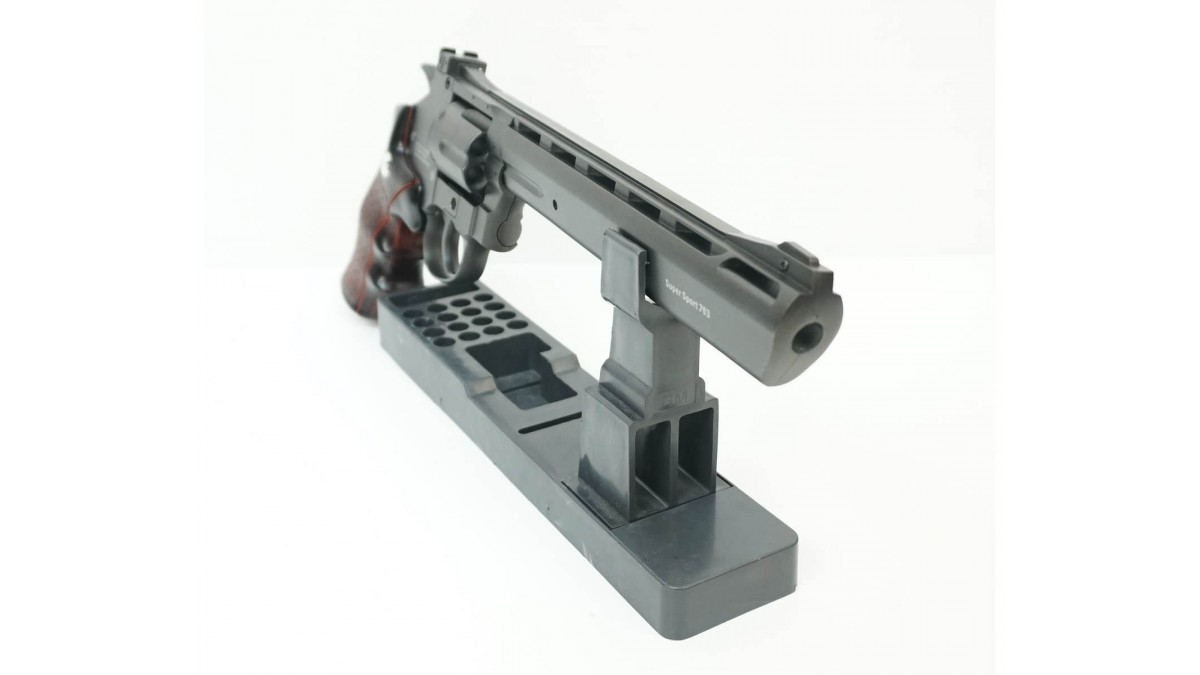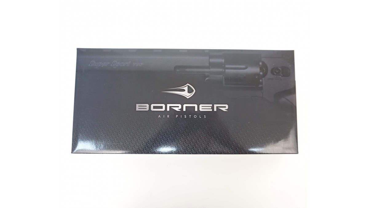 Выглядит Борнер Супер Спорт 703 внушительно. Ствол длиной 8 дюймов придает ему серьезный вид. Вес пистолета 1,02 кг создает большую реалистичность стрельбы. Стальной и гладкий ствол, как и рамка револьвера, имеет темное матовое покрытие. Наверху ствола расположено ребро жесткости, на котором находятся шесть продолговатых щелей. Рельса для планки Вивера у Borner Super Sport 703 размещена прямо над барабаном. После установки на планке прицела его можно регулировать с помощью винтов в по вертикали и горизонтали. Рукоятка выполнена из пластика, но её покрытие стилизовано под красное дерево. На её передней части есть крупные выемки под пальцы. Боковые накладки шершавые, что позволяет надежно удерживать револьвер в руке. Кнопка освобождения барабана, расположенная на рамке с левой стороны, играет роль предохранителя.