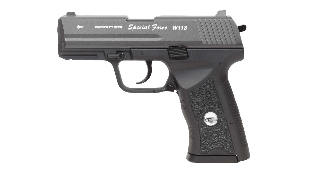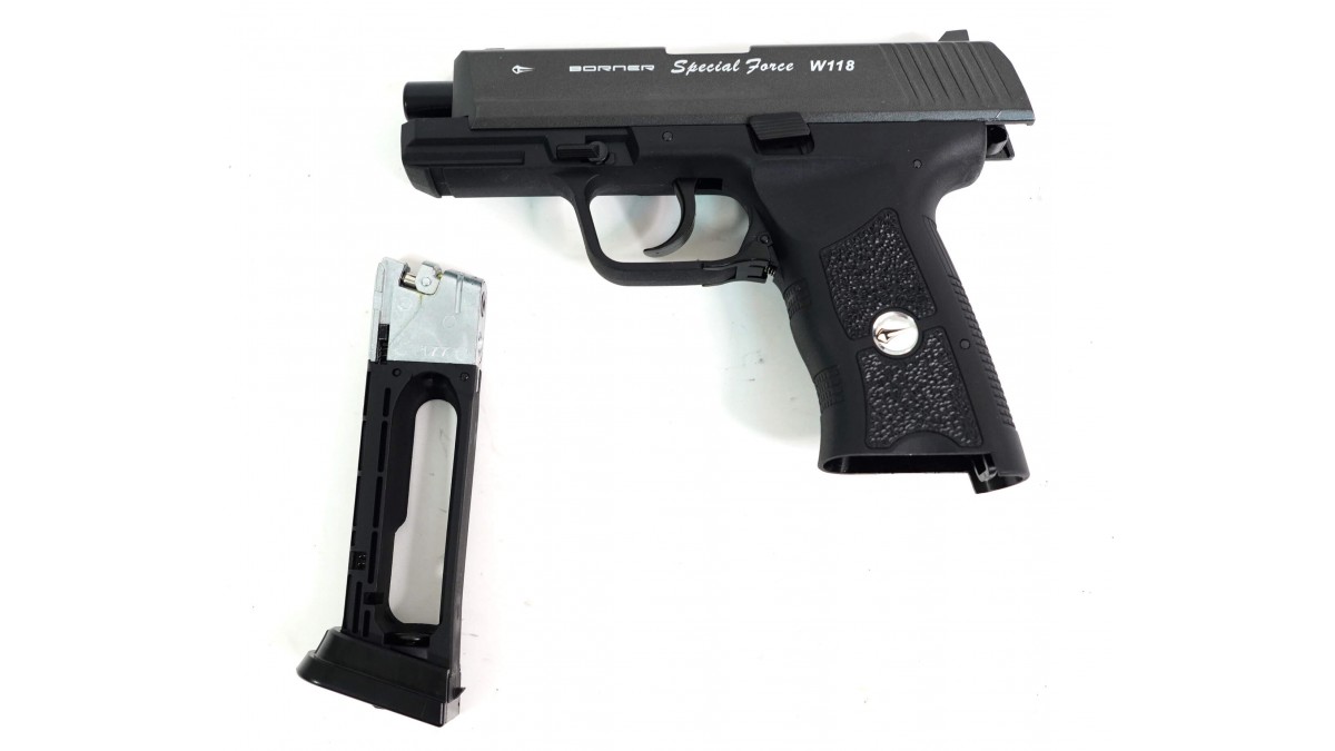 Borner W118 - это ещё одна пневматическая копия пистолета Heckler & Koch от компании Borner. Пистолет работает от газовых 12-граммовых баллончиков, имеет гладкий ствол, что позволяет использовать в качестве снарядов только шарики BB.