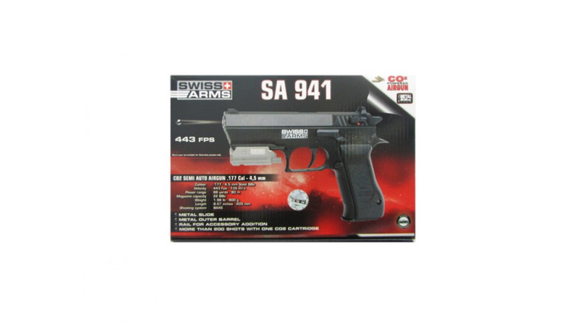 Копирует израильский пистолет Jericho 941. Затвор и магазин выполнены из металлического сплава, рамка - из ударопрочного пластика. Все внутренние компоненты также выполнены из металла, что делает пистолет надёжным и неприхотливым. Блоубек отсутствует, затвор неподвижен. Отличительной чертой пневматического пистолета Swiss Arms 941 является наличие планки Вивера под стволом, что даёт возможность установить лазерный целеуказатель (ЛЦУ), тактический фонарь или планки для крепления различных прицелов.