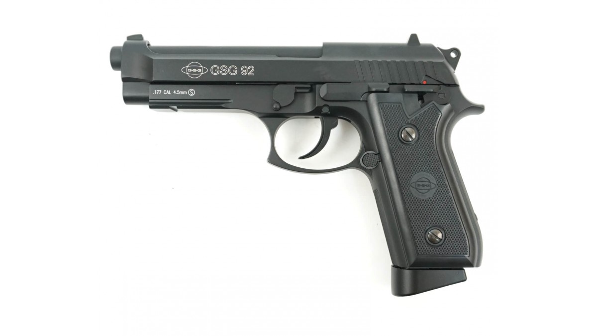 Копия боевого пистолета Taurus PT 92. Это газобаллонный пистолет с гладким стволом и мощностью 1,6 Дж.