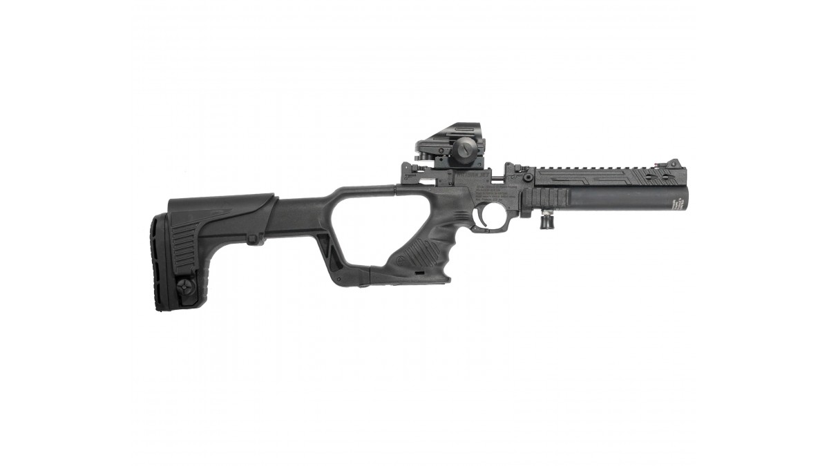 Производитель представил новый пневматический пистолет Хатсан Джет1 калибра 5.5 мм, конструкция которого допускает использование этого оружия на ближних и средних дистанциях. Разработчик применил нетривиальное решение - если к образцу присоединить комплектный приклад, пистолет превращается в практически полноценный карабин.