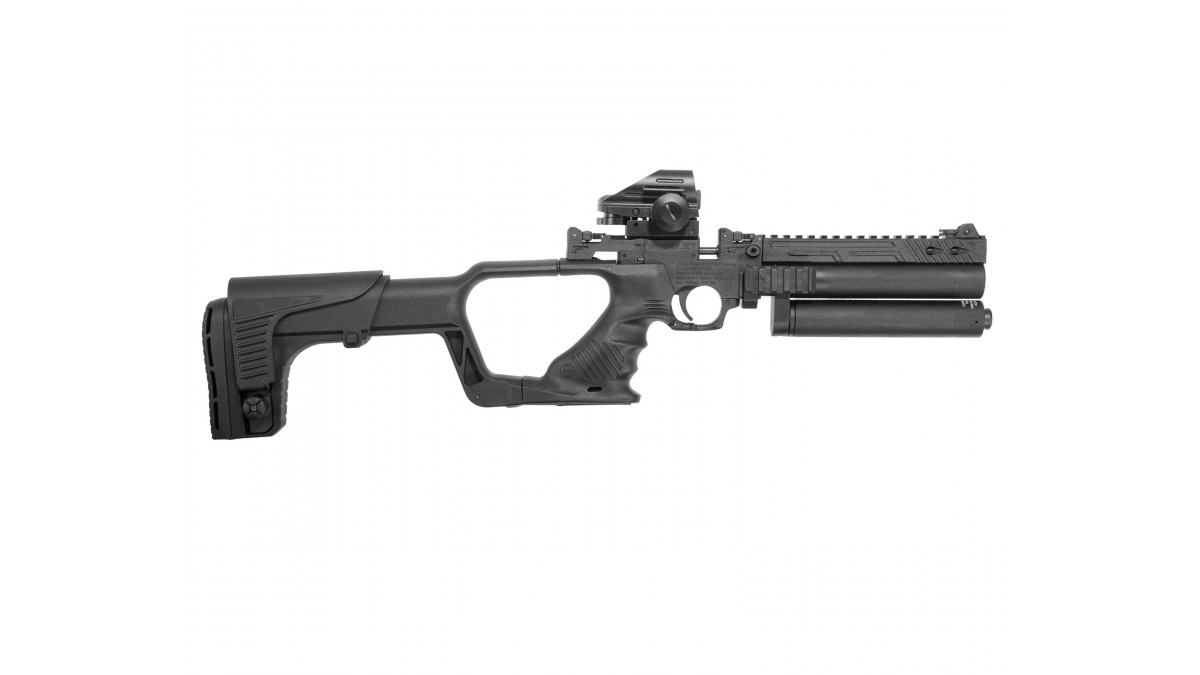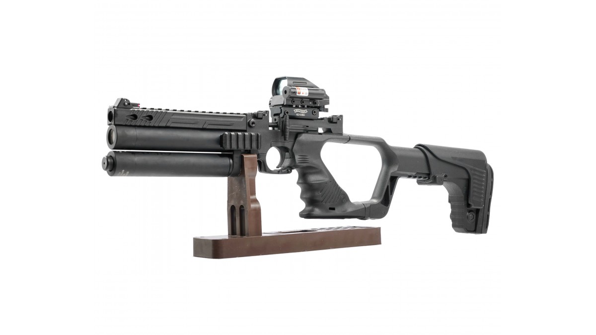 Комплектация изделия позволяет пользователю в нужное время трансформировать пистолет в полноценный укороченный карабин. Для этого необходимо прикрепить съемный приклад, настроить его габариты под свои антропометрические параметры и выставить прицел. В образце предусмотрено три прицельных устройства – мушки и целик складываются и откидываются по необходимости.