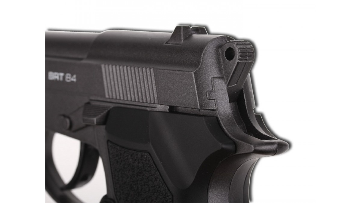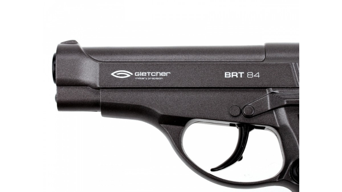 Ударно спусковая система механизмов Gletcher BRT 84 дает возможность производить выстрелы только в одном режиме – режиме самовзвода. Для того, чтобы вероятность случайного выстрела была нулевой, пистолет оборудован практичным предохранителем. Корпус цельнометаллический, состоит из двух половин, которые соединены винтами. Кожух-затвор неподвижен и не является отдельной деталью.