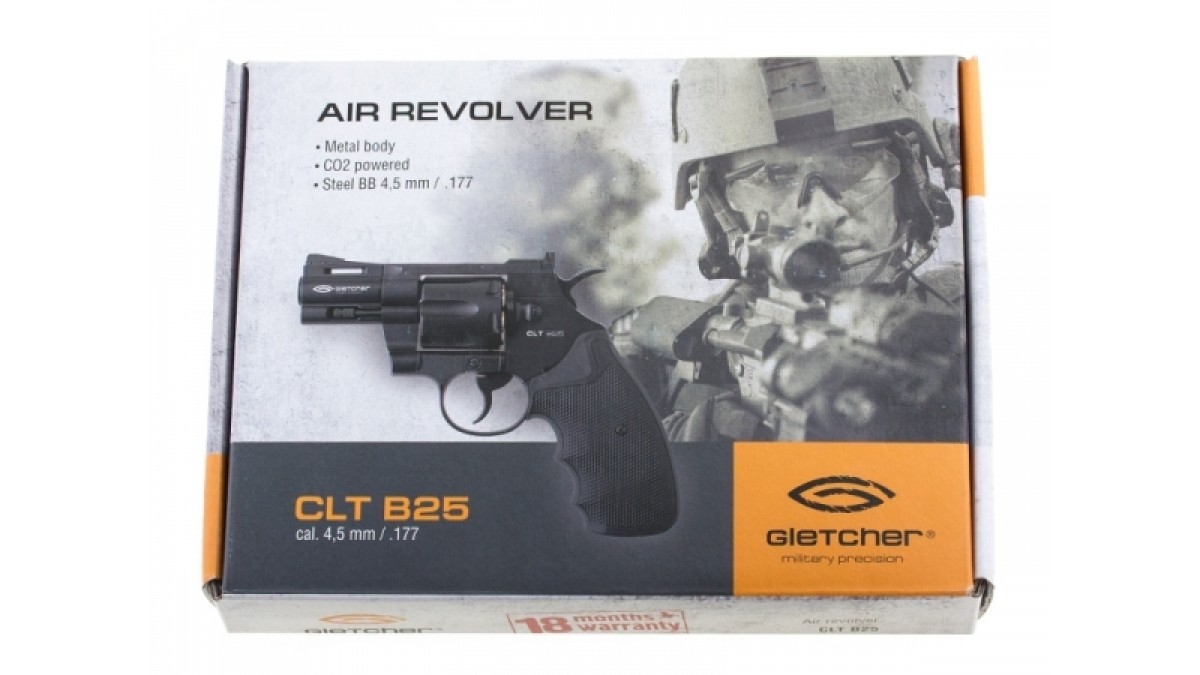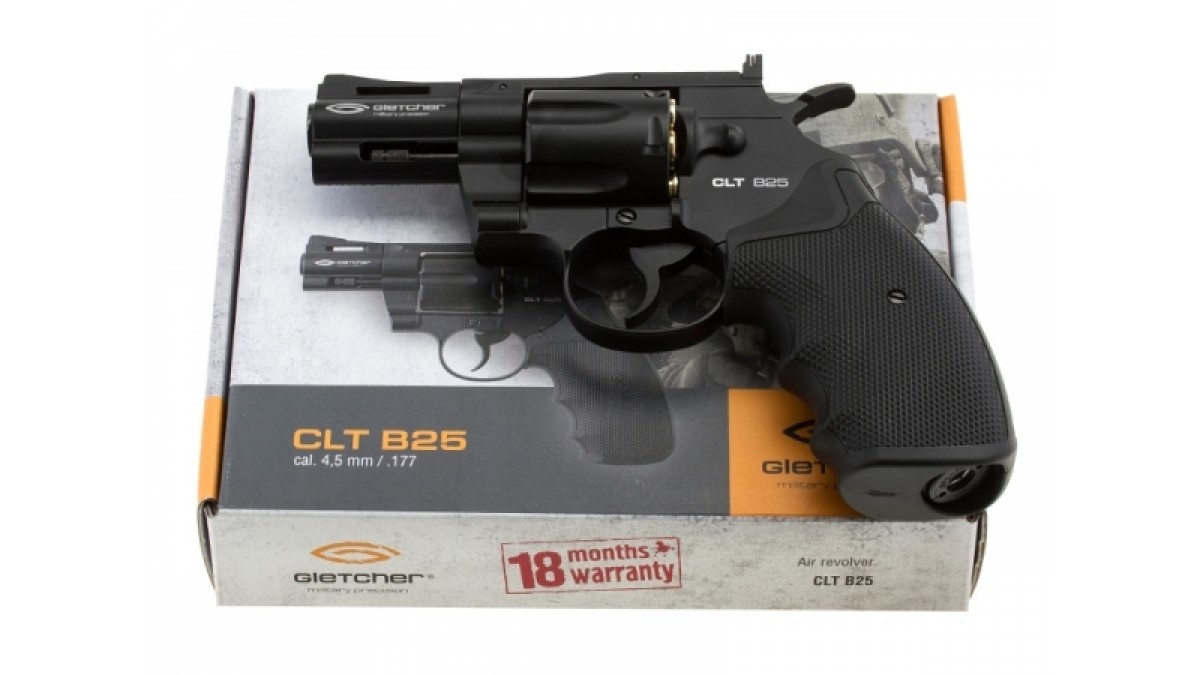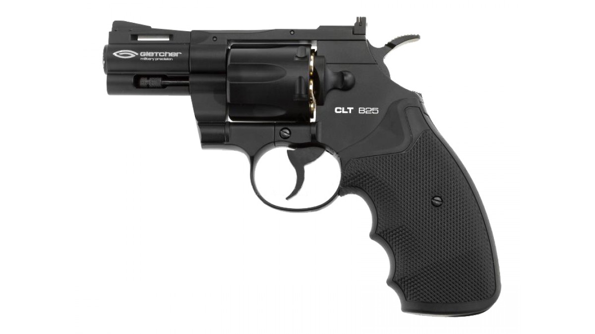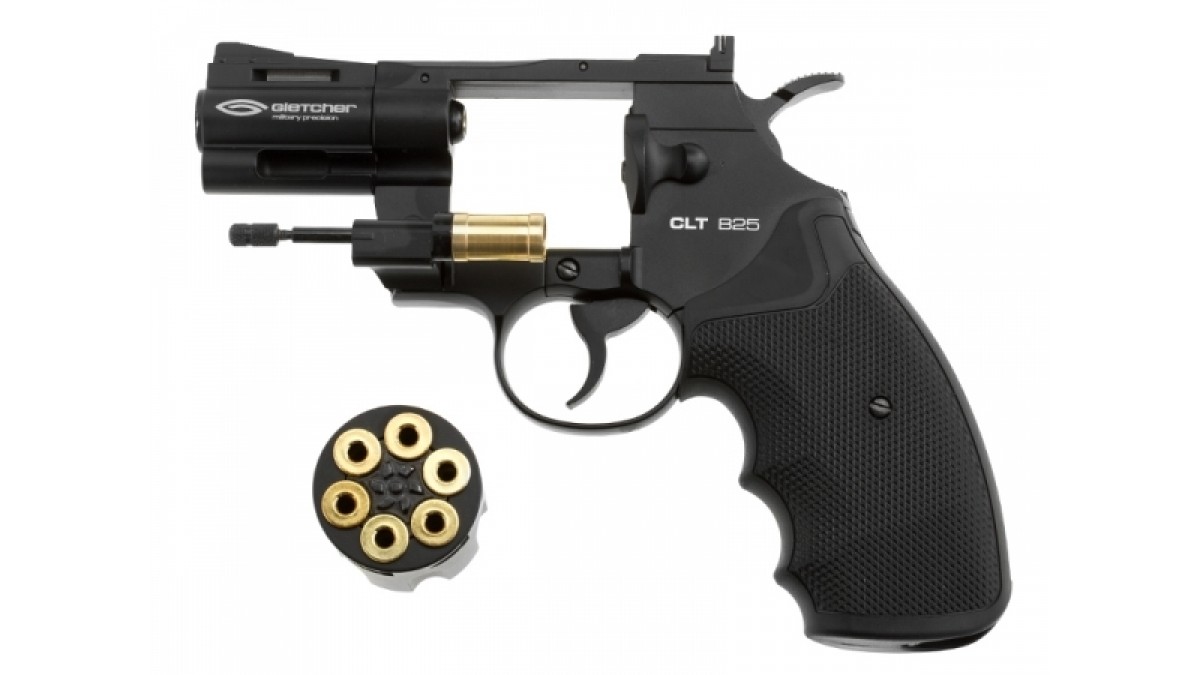 Gletcher CLT B25 относится к газобаллонной пневматике. Скрытый поджимной винт баллона СО2 обеспечивает большую визуальную схожесть с оригиналом. Фальшпатроны и откидывающийся барабан дают полную реалистичность заряжания револьвера и извлечения стреляных гильз. В фальшпатроны вставляются ВВ шарики калибра 4,5 мм.