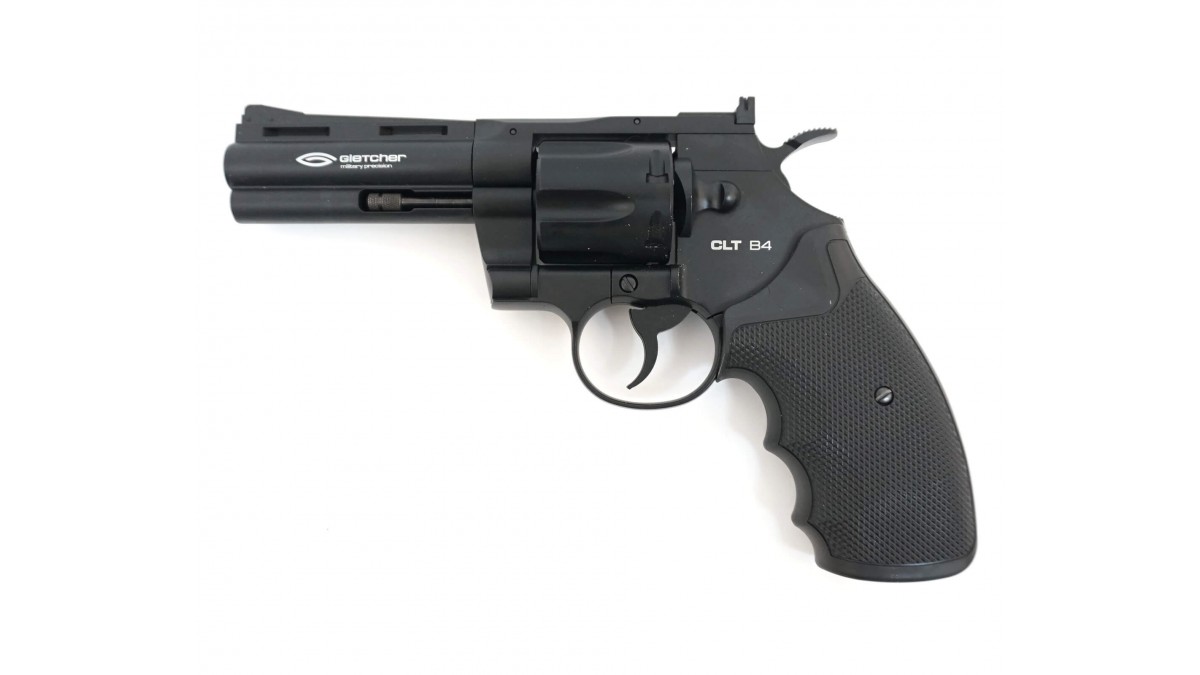 Пистолет оснащен скрытым предохранителем, блокирующим курок. Ударно-спусковой механизм двойного действия (Double Action) обеспечивает стрельбу как самовзводом, так и с предварительным взведением курка. Ухватистая рукоять с резиновыми накладками обеспечивает комфортное удержание при стрельбе. Целик регулируемый. Скрытый поджимной винт баллона обеспечивает большую визуальную схожесть с оригиналом. Фальшпатроны увеличивают реалистичность обращения с револьвером Gletcher CLT B4. Откидывающийся барабан дает полную реалистичность заряжания револьвера Gletcher CLT B4 и извлечения «стреляных гильз».