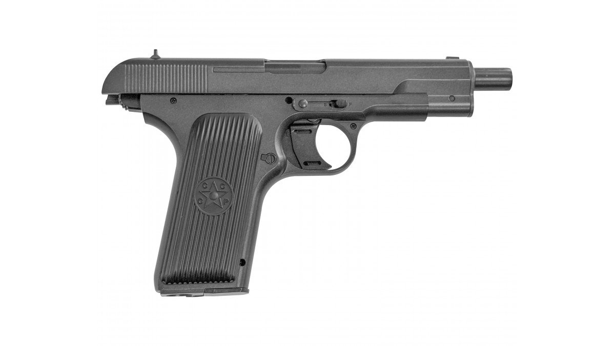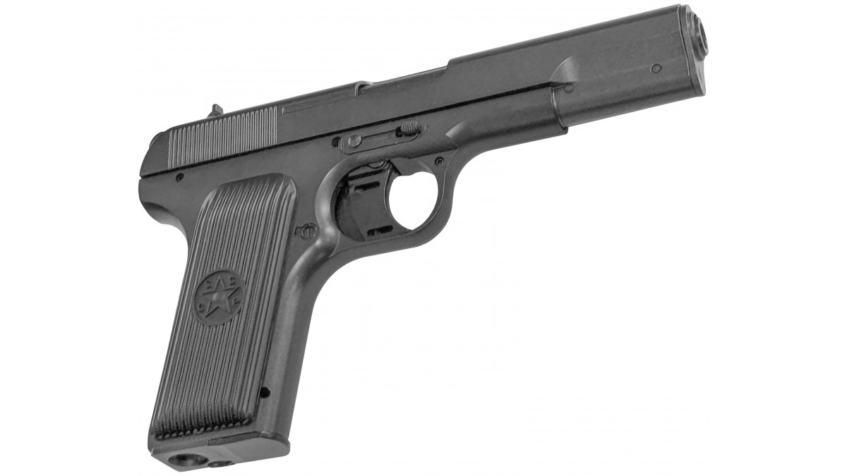 Пистолет воссоздает дизайн Тульского Токарева (ТТ-33) с металлическим кожухом ствола и рамкой, что повышает аутентичность и долговечность. Вес модели — 0.72 кг, длина — 195 мм, что соответствует габаритам оригинального огнестрельного прототипа. Рукоять оснащена ребристыми накладками для надежного хвата и кольцом для крепления страховочного ремешка. Подвижный затвор (система Blowback) имитирует отдачу, а ручное взведение позволяет фиксировать его в заднем положении.