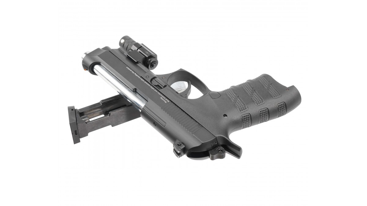 Для функционирования пневматики также потребуется поместить баллончик 12 г CO2 в специальную нишу отмыкаемого магазина. Емкость с газом поджимается винтом до прокола носика, что сопровождается характерным шипящим звуком. При стрельбе шарик вылетает из ствола со скоростью до 125 метров в секунду.