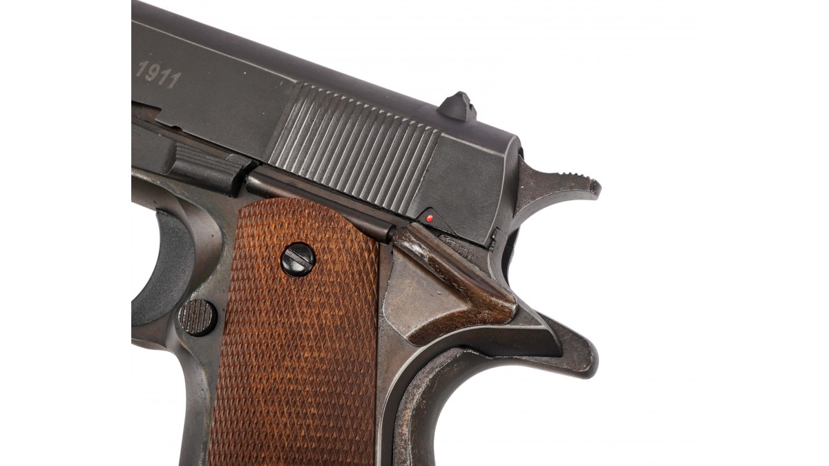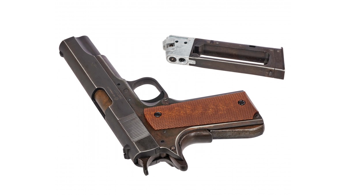 Пистолет воссоздает классический дизайн Colt M1911 с металлической рамкой и слайдом, обработанными эффектом искусственного состаривания. Вес модели — 870 г, длина — 220 мм, что обеспечивает устойчивость и реалистичные тактильные ощущения. Рукоять оснащена полимерными накладками, имитирующими текстуру дерева, с рельефной поверхностью для надежного хвата. Функционал включает подвижный курок, флажковый предохранитель и систему Blowback: при выстреле слайд отводится назад, имитируя отдачу. Затворная задержка активируется при опустошении магазина.