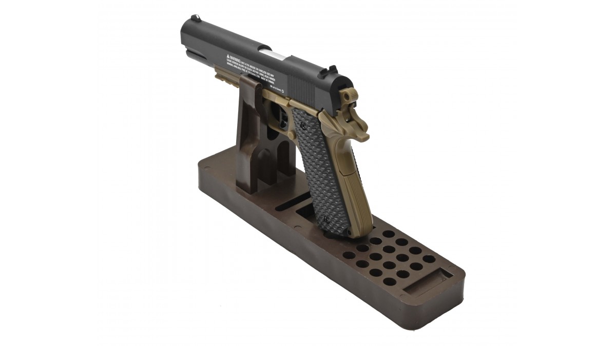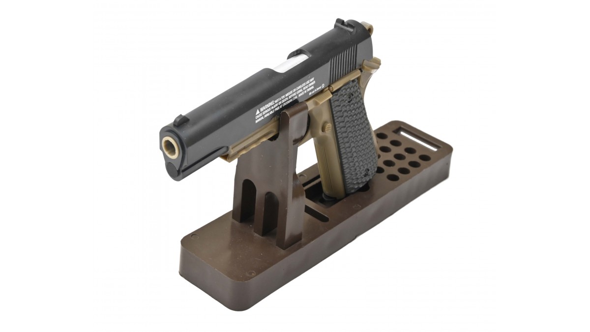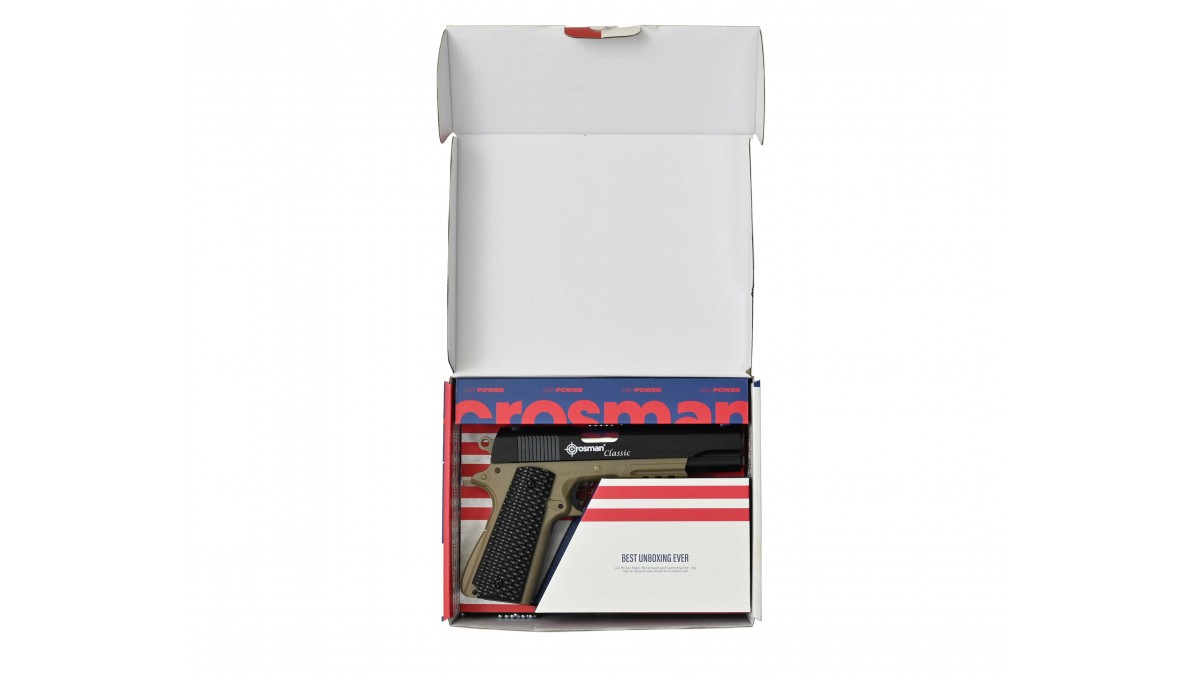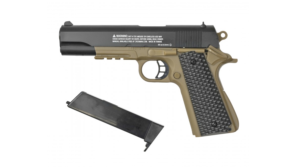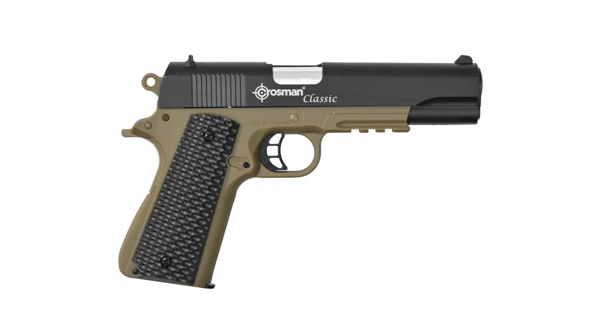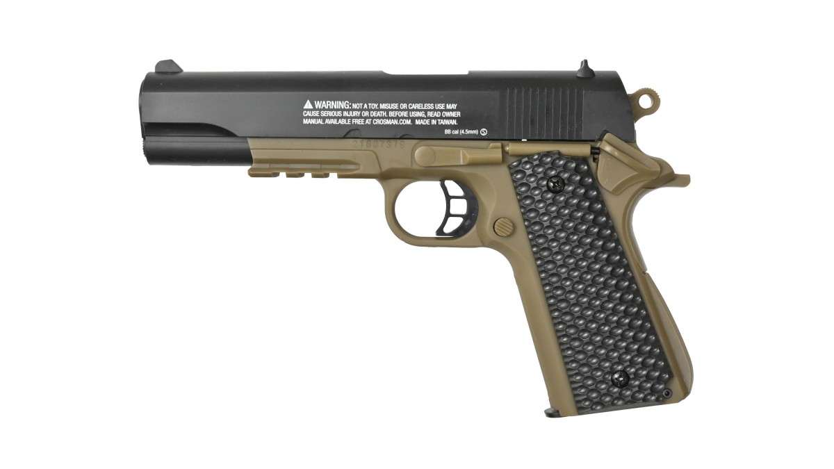 Пневматический пистолет Кросман S1911 создавали с оглядкой на специальные модификации классического образца. Тактическая вариация включает подствольный Вивер, обновленную фактуру рукояти и курка, а также облегченную клавишу спуска. Пистолет представлен в пустынной расцветке, популярной у американского спецназа.