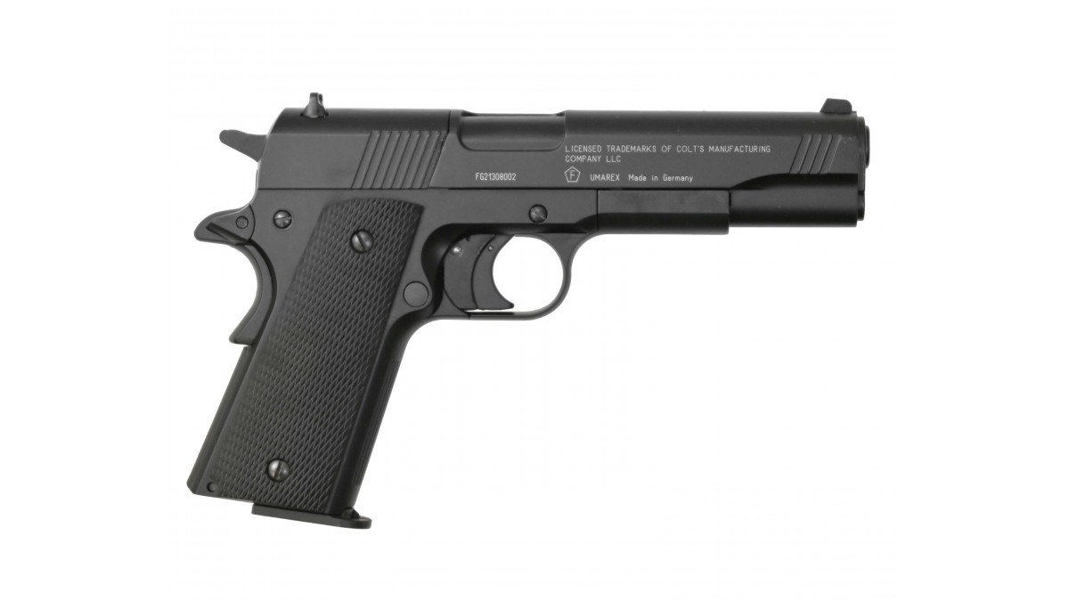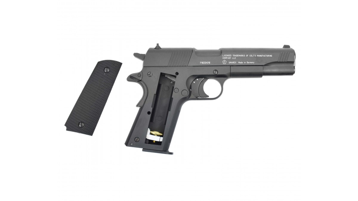 Умарекс Кольт 1911 использует 4.5 миллиметровые свинцовые заряды. Компания рекомендует использовать пули массой до 0.57 гр. Пролетая через нарезной ствол снаряд разгоняется до 130 метров в секунду.