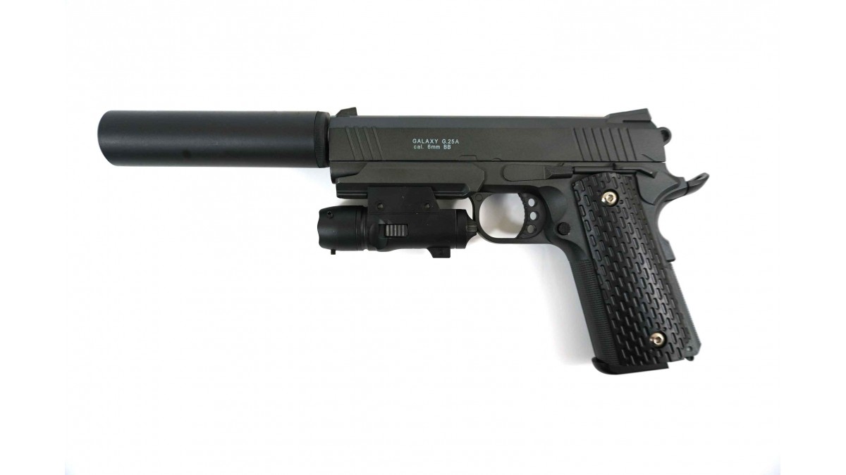 Страйкбольный пистолет Galaxy G.25A (Colt 1911 Rail) с ЛЦУ и глушителем