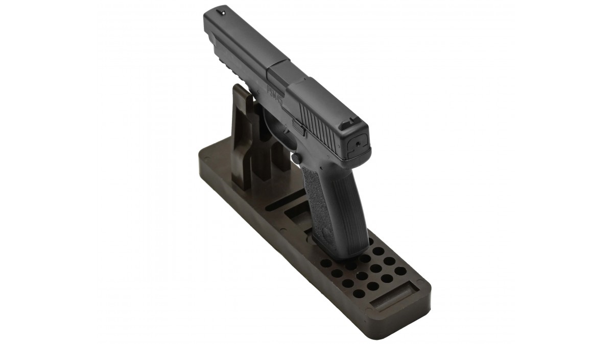 Пневматический пистолет Кросман ПСМ 45 имеет рамку из ударопрочного полимера. Из функциональных деталей в ней содержится подствольный Weaver для дополнительного оборудования и клавиша изъятия магазина, по левую сторону. Шероховатое покрытие рукояти вместе с пазами для пальцев создают все условия для отсутствия скольжения при удержании.