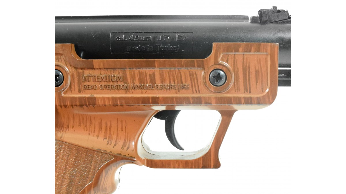 Корпус пистолета, а также рукоять изготавливаются из пластика под дерево, которое отличается прочностью и устойчивостью к ударным, а также давящим нагрузкам. Кроме того, использование полимера под дерево делает пистолет легким сохраняя его вес в пределах 0.95 килограмма.