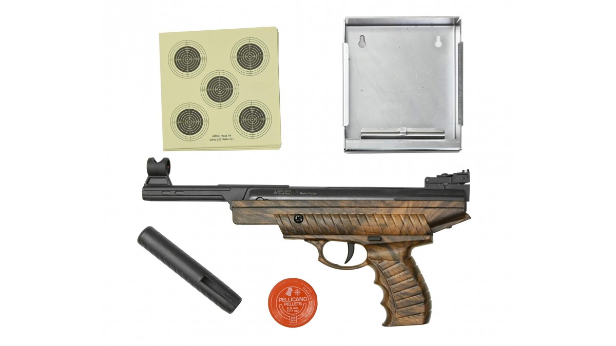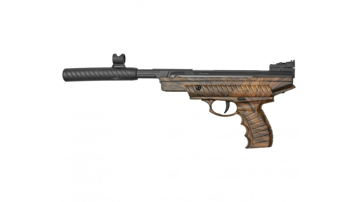 Пружинно-поршневой пистолет с нарезным стволом от турецкой компании Hatsan. Стреляет свинцовыми пулями предпочтительно весом до 0,5 г. При таком весе пули скорость вылета будет около 110 м/с, что достаточно для прицельной стрельбы на 30 м.