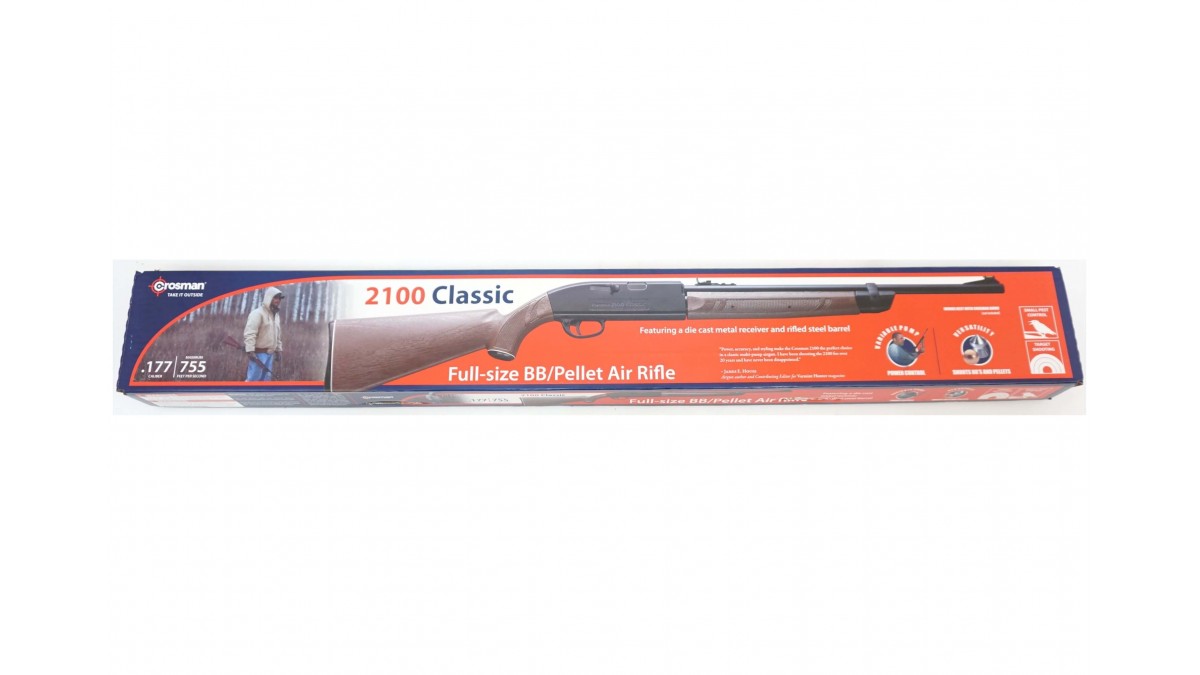 Масса винтовки Crosman 2100 B - 2,18 кг, её общая длина 1010 мм. Лёгкий вес данной винтовки позволяет её брать с собой при отправлении на природу, где можно с ней успешно охотиться. Сама винтовка сбалансированная и прикладистая, стрелять из неё удобно, поскольку отдачи почти нет. Её ложе и цевье созданы из прочного коричневого пластика, их можно при разборке отделить от основы.