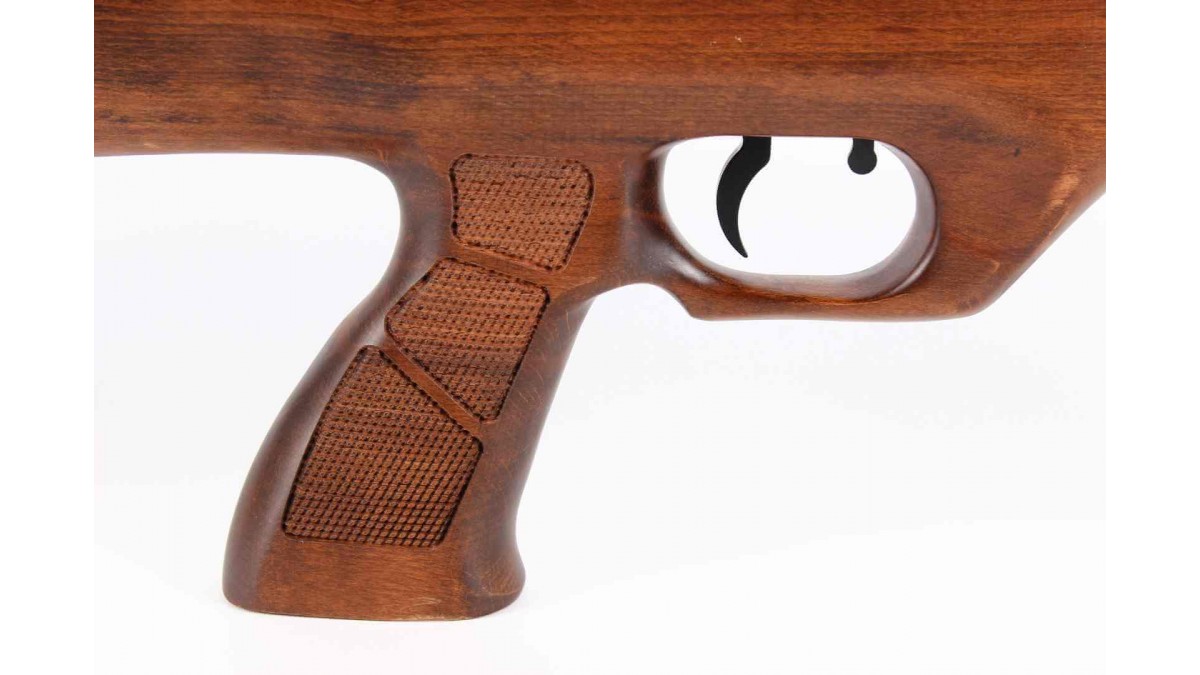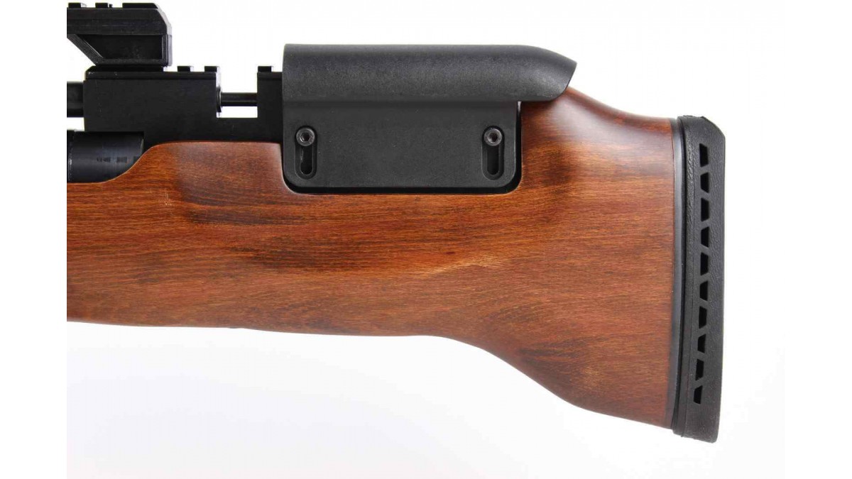 Корпус винтовки изготовлен из высокопрочной древесины; на рукояти рифление для крепкого и надежного хвата; на прикладе - резиновый затыльник.