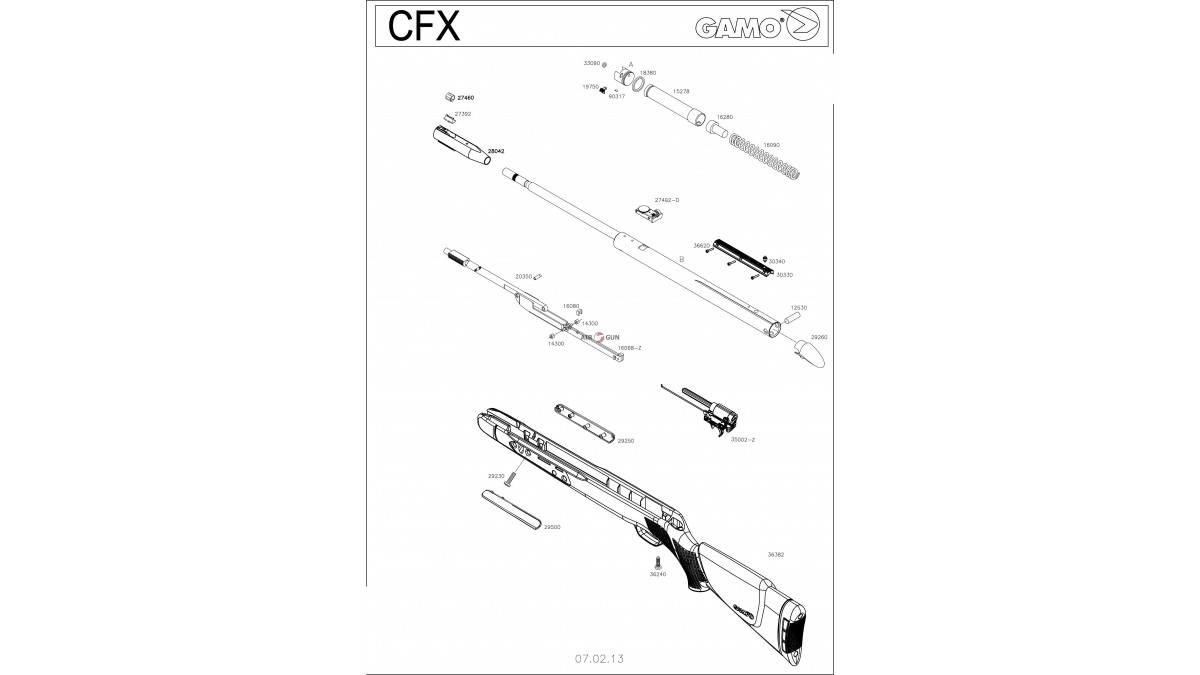 - винтовка Gamo CFX относится к классу пружинно-поршневой пневматики, ее взведение происходит подствольным рычагом;