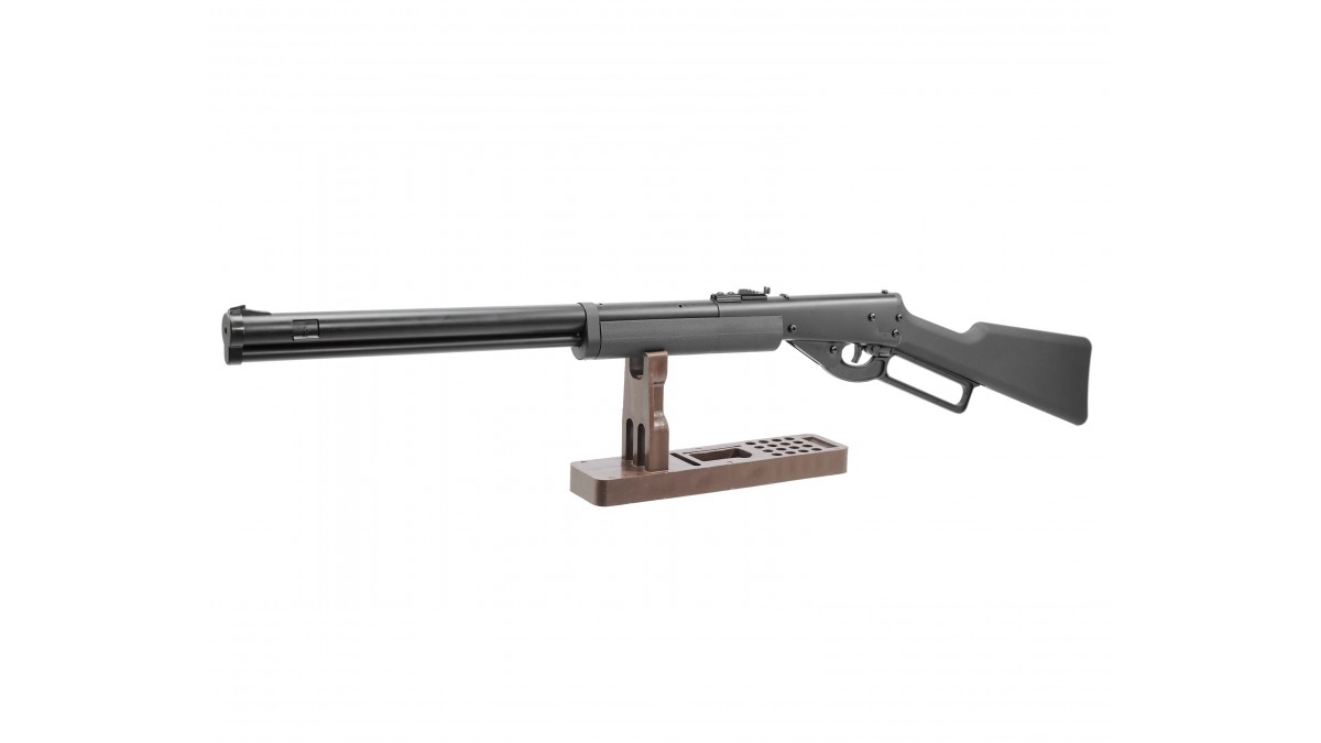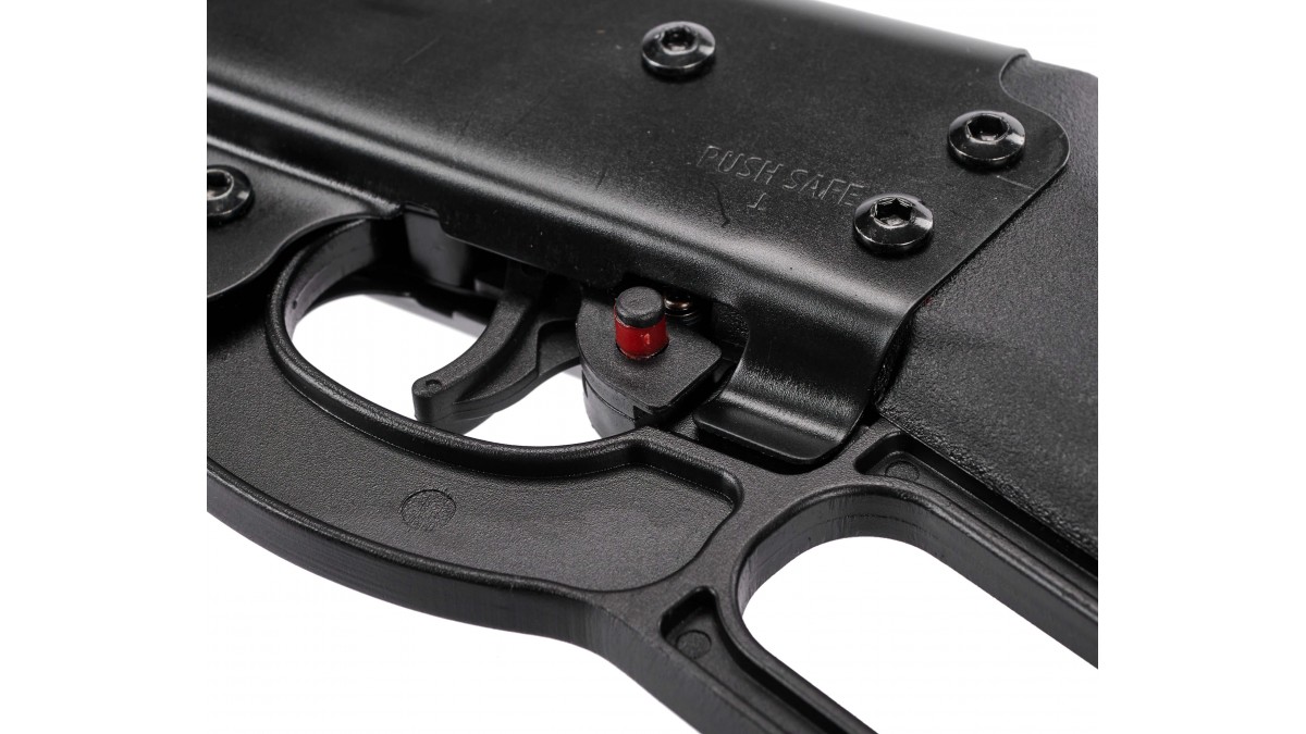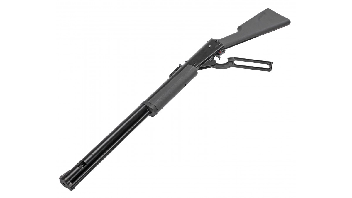 Винтовка выполнена в стиле классических рычажных карабинов Дикого Запада. Металлический ствол и затворная коробка сочетаются с полимерной фурнитурой черного цвета, что снижает вес до 1.3 кг без ущерба прочности. Рычаг перезарядки (скоба Генри) расположен под спусковой скобой, обеспечивая быструю перезарядку. Эргономичная форма приклада и цевья, а также встроенный магазин на 550 шариков делают модель удобной для длительной стрельбы.