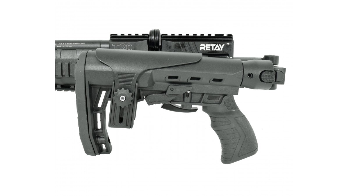 Retay T20 оснащена эргономичной пистолетной рукоятью с выемками под пальцы для комфортного удержания оружия. Для максимальной вкладки компания выпускает данную модель винтовки со складным телескопическим прикладом, который возможно настроить индивидуально под нужды стрелка.