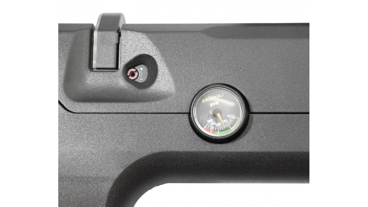 Заполнение рекомендуется выполнять до 250 Бар, так как избыточное давление способно привести к деформации уплотнителей и преждевременному выходу механизма из строя. Для контроля показателей с правой стороны корпуса винтовки предусмотрен манометр, рядом с которым присутствует специальный регулировочный винт. Вращение элемента влияет на положение внутренней перекрывающей заслонки, позволяя настроить резкость выстрела под конкретную задачу.