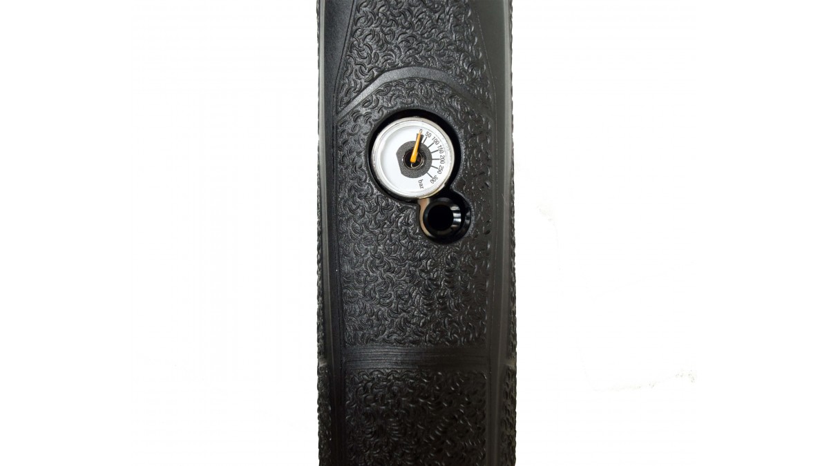 Давление в колбе контролируется манометром у заправочного штуцера на цевье. Одной заправки баллона хватает в среднем на 40-60 выстрелов в зависимости настроенного усилия поджима боевой пружины ударника.