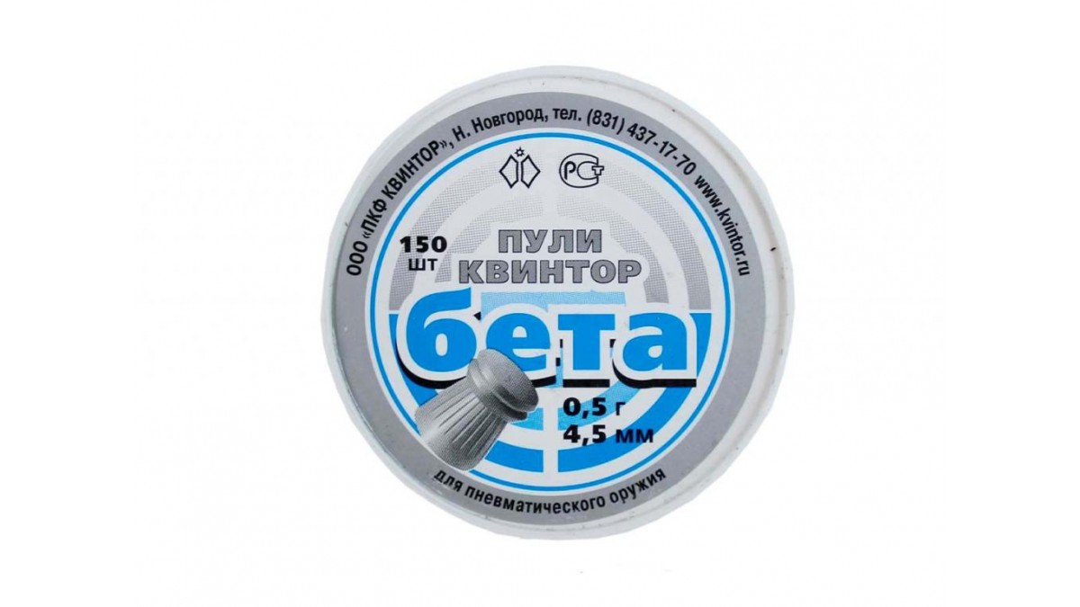 Целевые свинцовые пули калибра 4,5 мм, вес 0,52 г, диаметр головной части - 4,29/4,55 мм, юбки - 4,50 мм, длина 5,91 мм. Пули для пневматики Бета отличаются усиленной обтюрацией головной части и повышенной стабилизацией хвостовой части, что увеличивает начальную скорость вылета пули из ствола и обеспечивает высокую кучность боя. Выпускается упаковками по 150 и 300 шт. Пули для пневматики Бетта имеют утяжеленную головную часть и два ведущих пояска, причем передний меньше заднего на 0,26 мм. «Беты» — довольно длинные для своего калибра «матчи» (5,91 мм), хотя и легкие (0,489 г).