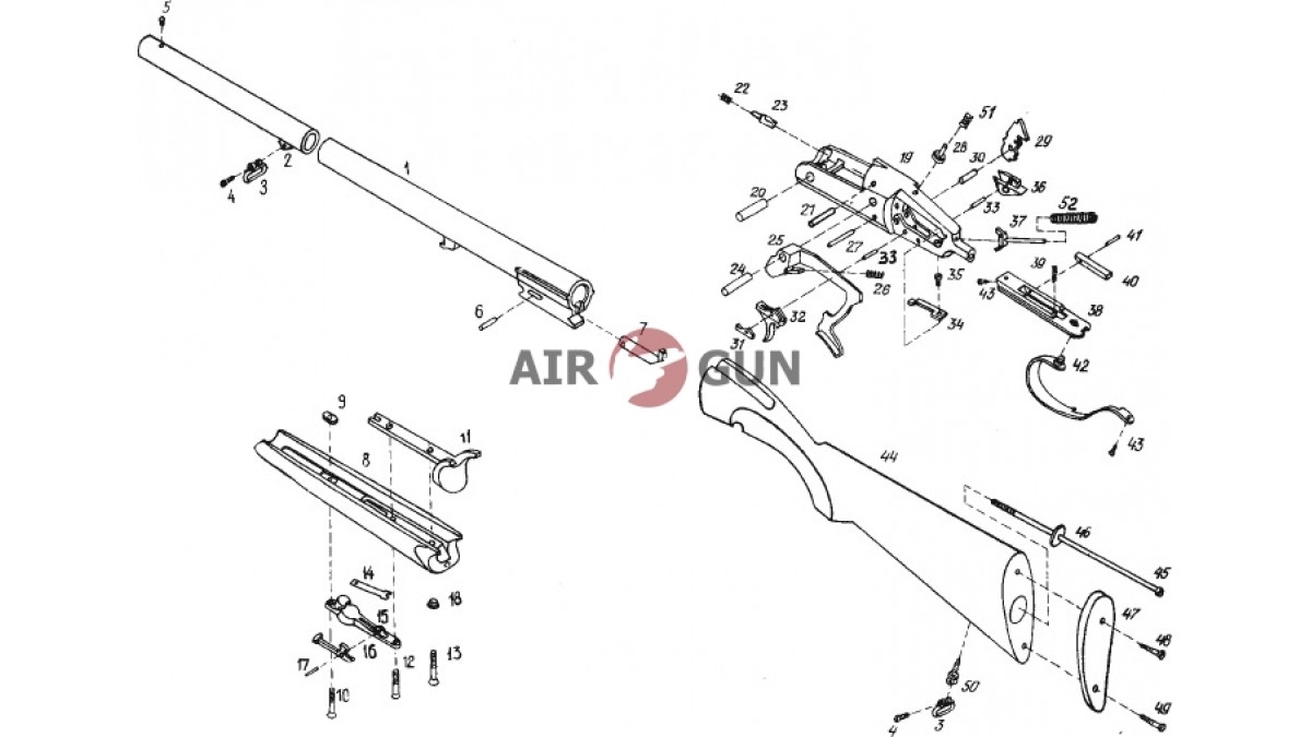 1 - Ствол с крюком; 2 - Основание антабки ствола; 3 - Кольцо антабки; 4 - Ось; 5 - Мушка; 6 - Штифт выбрасывателя; 7 - Выбрасыватель; 8 - Цевье; 9 - Гайка цевья; 10 - Винт шарнира; 11 - Шарнир цевья; 12 - Винт шарнира; 13 - Винт шарнира; 14 - Пружина; 15 - Корпус защелки; 16 - Защелка цевья; 17 - Штифт; 18 - Втулка цевья; 19 - Коробка; 20 - Ось шарнира; 21 - Штифт бойка; 22 - Пружина бойка; 23 - Боек; 24 - Ось рычага; 25 - Рычаг запирания; 26 - Пружина рычага; 27 - Штифт пружины рычага; 28 - Указатель; 29 - Курок; 30 - Ось курка; 31 - Шептало; 32 - Крючок спусковой; 33 - Ось крючка; 34 - Пружина крючка; 35 - Винт пружины крючка; 36 - Предохранитель; 37 - Толкатель; 38 - Личинка; 39 - Пружина задержки; 40 - Задержка рычага запирания; 41 - Ось задержки; 42 - Скоба предохранительная; 43 - Винт скобы; 44 - Приклад; 45 - Винт; 46 - Шайба; 47 - Затылок приклада; 48 - Шуруп; 49 - Шуруп; 50 - Основание антабки приклада; 51 - Пружина указателя; 52 - Пружина боевая.